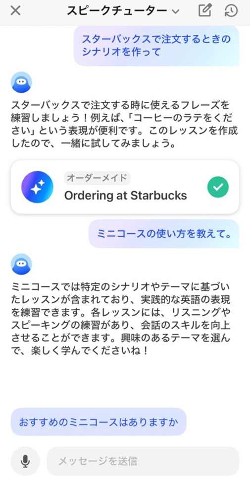 仕上げは実践です。日常・旅行・ビジネスなど、リアルな場面を想定したロールプレイ形式でAIと会話します。