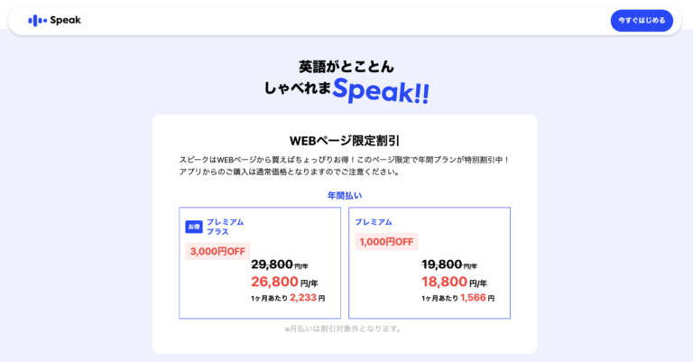 スピークでは不定期でキャンペーンが実施されることがあります。現在、年額プランに申し込むと6,000円割引のキャンペーンが行われている場合があります(時期によって変わるため、公式サイトでご確認ください)。キャンペーン中は通常よりさらにオトクになるので、検討中の方はチェックしてみましょう。